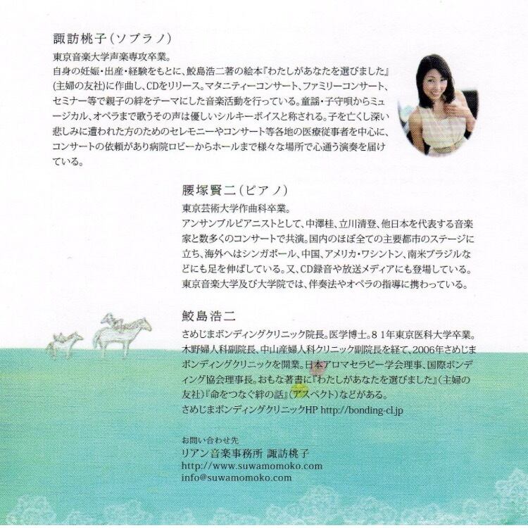 ◆ 作詞者 鮫島浩二(さめじま・こうじ) さめじまボンディングクリニック院長。医学博士。81年東京医科大学卒業。木野婦人科副院長、中山産婦人科 クリニック副院長を経て、2006年さめじまボンディングクリニックを開業。日本アロマセラピー学会理事、 国際ボンディング協会理事長。おもな著書に『わたしがあなたを選びました』(主婦の友社)『命をつなぐ絆の話』 (アスペクト)などがある。 ◆作曲 諏訪桃子(すわももこ) 東京音楽大学声楽専攻卒業。自身の妊娠・出産の経験をもとに、鮫島浩二著の絵本『わたしがあなたを選びました』(主婦の友社)に作曲し、CDをリリース。マタニティーコンサート、ファミリーコンサート、セミナー等で親子の絆をテーマにした音楽活動を行っている。童謡・子守唄からミュージカル、オペラまで歌うその声は優しいシルキーボイスと称される。子を亡くし深い悲しみに遭われた方のセレモニーやコンサート等、各地の医療従事者を中心に、コンサートの依頼があり病院のロビーからホールまで様々な場所で心通う演奏を届けている。 ◆編曲 腰塚賢二(ピアノ) 東京芸術大学作曲科卒業。アンサンブルピアニストとして、中澤桂、立川清登、他日本を代表する音楽家と数多くのコンサートで共演。国内のほぼすべての、主要都市のステージに立ち、海外へはシンガポール、中国、アメリカ・ワシントン、南米ブラジルなどにも足を伸ばしている。又、CD録音や放送メディアにも登場している。東京音楽大学及び大学院では、伴奏法やオペラの指導に携わっている。 CDジャケット絵:松倉香子(まつくら・かおり)1 969年東京生まれ。専修大学文学部卒業・書籍装画、雑誌、広告、webなどで活動中。2010年ザ・チョイス大賞受賞。